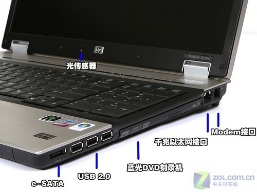 左側(cè)接口 8730w右側(cè)提供了一個(gè)升級托架,可以升級第二塊硬盤,為原硬盤提供數(shù)據(jù)保護(hù),或組建RAID 0陣列提升磁盤讀寫能力。升級托架也可以安裝光驅(qū)。這款送測的8730w配置了一臺(tái)藍(lán)光R/RE DVD+/-RW SuperMulti DL光驅(qū),可以創(chuàng)建、錄制、重寫和回放高清視頻。在屏幕的中下方位置提供了一個(gè)光傳感器,屏幕可以根據(jù)環(huán)境光線自動(dòng)調(diào)節(jié)亮度,非常便捷。