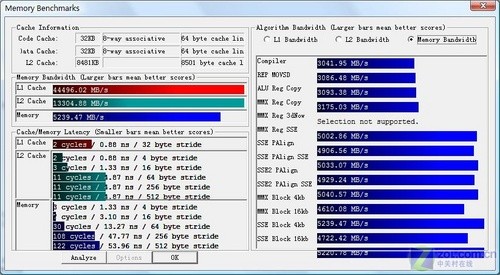 在POV-RAY測試中移動(dòng)版酷睿至尊Q9100依舊表現(xiàn)優(yōu)秀,雖然主頻不高,但是四核渲染時(shí)間和主頻3.0Ghz的IntelCore 2 Extreme QX6850幾乎是一樣的。(QX6850四核渲染時(shí)間為2分16秒)這足以說明工藝進(jìn)步對處理器性能的提升還是顯著的。 2、內(nèi)存帶寬測試 得益于Intel PM45芯片組和DDR2-800規(guī)格內(nèi)存的應(yīng)用,8730w在內(nèi)存帶寬測試中獲得了優(yōu)秀的表現(xiàn),開啟雙通道后內(nèi)存帶寬達(dá)到了5239.47MB/s,和Intel 5400芯片組+DD2667內(nèi)存的組合的帶寬相差不多,內(nèi)存帶寬方面足以媲美現(xiàn)今的主流塔式工作站。