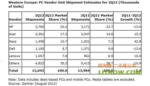 全球著名的獨立咨詢公司高德納,于今日發(fā)布了2012年第二季度西歐在PC市場的調(diào)查報告,數(shù)據(jù)報告中顯示,在這一個季度中西歐國家在PC市場臺式機的出貨量出現(xiàn)皮軟件下滑趨勢,反到是移動PC出現(xiàn)上漲趨勢,增長到達百分之4。總體PC出貨量同期比下降了百分之2.4,光臺式機就同比下降了百分之12.8。然后數(shù)據(jù)中還列出了各個品牌在西歐國家的市場出貨量的情況,如下圖所示。從圖中不難看出,惠普電腦占據(jù)榜首位置,可依然與去年同期比甩所下降。排在第二位的是臺灣的宏基電腦,接著是依然是來自臺灣的華碩電腦。而戴爾掉到了第三位。接下來是中國大陸的聯(lián)想,出貨量呈現(xiàn)的是同期比增長的。從圖中可以注意到的是,蘋果電腦進入此榜單,在英國中銷量進入前五。