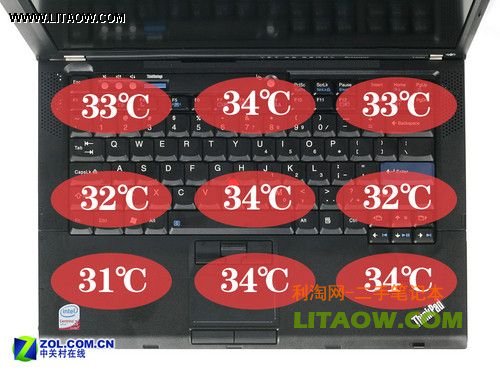 盡管整機(jī)使用了ATI Mobility Radeon HD3470的獨(dú)立顯卡設(shè)計(jì),但由于機(jī)身模具的出色設(shè)計(jì)以及英特爾迅馳2移動(dòng)計(jì)算平臺(tái)出色的低功耗低發(fā)熱控制。因此我們能夠看到,聯(lián)想ThinkPad T400的機(jī)身正面、背部及出風(fēng)口溫度都相對(duì)較低,不會(huì)對(duì)用戶的正常操作造成任何影響。