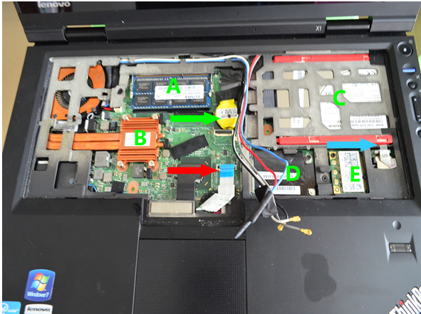 C的位置是主硬盤的地方可以通過側(cè)面的硬盤蓋來完成拆卸工作,這個和其他的比如二手T420S之類的筆記本一樣拆,并且和T420S一樣的7毫米薄盤如果要自己升級的話需要注意這個硬盤的厚度,當(dāng)然了預(yù)裝的一般都是固態(tài)的硬盤三星和英特爾的居多,D的位置則是用來升級硬件的地方了主要就是用來升級小的SSD固態(tài)硬盤,或者是內(nèi)置的3G模塊 X1筆記本已經(jīng)預(yù)先設(shè)計好了天線位置,E的位置是這款筆記本內(nèi)置的無線三頻的安裝位置,一般來說沒必要升級和改動,箭頭藍(lán)色的位置是側(cè)面控制面板包含了開關(guān)電源按鈕以及聲音的控制大小快捷鍵的電路板,紅色的則是觸控面板和指紋控制的數(shù)據(jù)線位置,綠色的就是主板的BIOS電池了這個電池主要是供給給主板的時間以及一些硬件設(shè)置保留,如果要更換的話需要一個一樣接口的才可以。