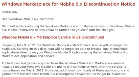 我們從官方了解到微軟已經(jīng)向使用過Windows Mobile Marketplace系統(tǒng)的用戶發(fā)送電子郵件通知,將告知停止一些技術(shù)支持和幫助等。 我們從郵件的內(nèi)容可以知道了,微軟定于2012年5月9日正式終止Windows Mobile 6.x的Marketplace服務(wù),那個(gè)時(shí)候使用者就不能下載以及更新和購買相關(guān)的程序了。 據(jù)我計(jì)算的話這個(gè)系統(tǒng)已經(jīng)有N年歷史了Windows Mobile系統(tǒng)使命即將徹底結(jié)束,不該微軟在通知用戶的時(shí)候還沒忘記力推自己的新操作系統(tǒng),那就是現(xiàn)在很火的Windows Phone 7.x操作系統(tǒng)!