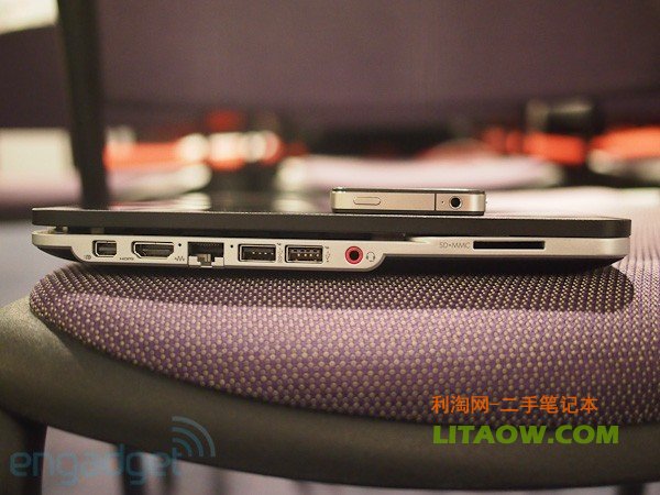 作為 Ultrabook ,Spectre 在厚度控制上并不算出彩。從上圖能夠發(fā)現(xiàn),Spectre 的屏幕厚度已經(jīng)與 iPhone 接近,機(jī)身整體的厚度與一張 SIM 卡的高度基本一致,這個(gè)厚度肯定不可以拿來(lái)切水果的。重量為 1.8kg,比 Air 重了 0.5kg,別拿在手上太久的話也還可以接受。