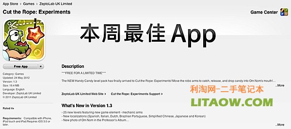 蘋果最近越來越多的對其APP應(yīng)用高店進(jìn)行改革,諸如編編輯精選,精品推薦,最佳排名,下載最多,熱門介紹及新品推薦等諸多方式,力圖給全球用戶尋找到更多精品應(yīng)用并帶來更多種的方式體驗APP應(yīng)用商店,給應(yīng)用商及用戶帶來諸多便利。今日蘋果在國外推客上,宣布新增一個應(yīng)用分類“本周最佳APP”,并提供免費下載,這周的最佳是切害繩子游戲,不知道大家玩沒有,沒有玩過的現(xiàn)在快去應(yīng)用商店免費下載吧,機(jī)會難得哦。